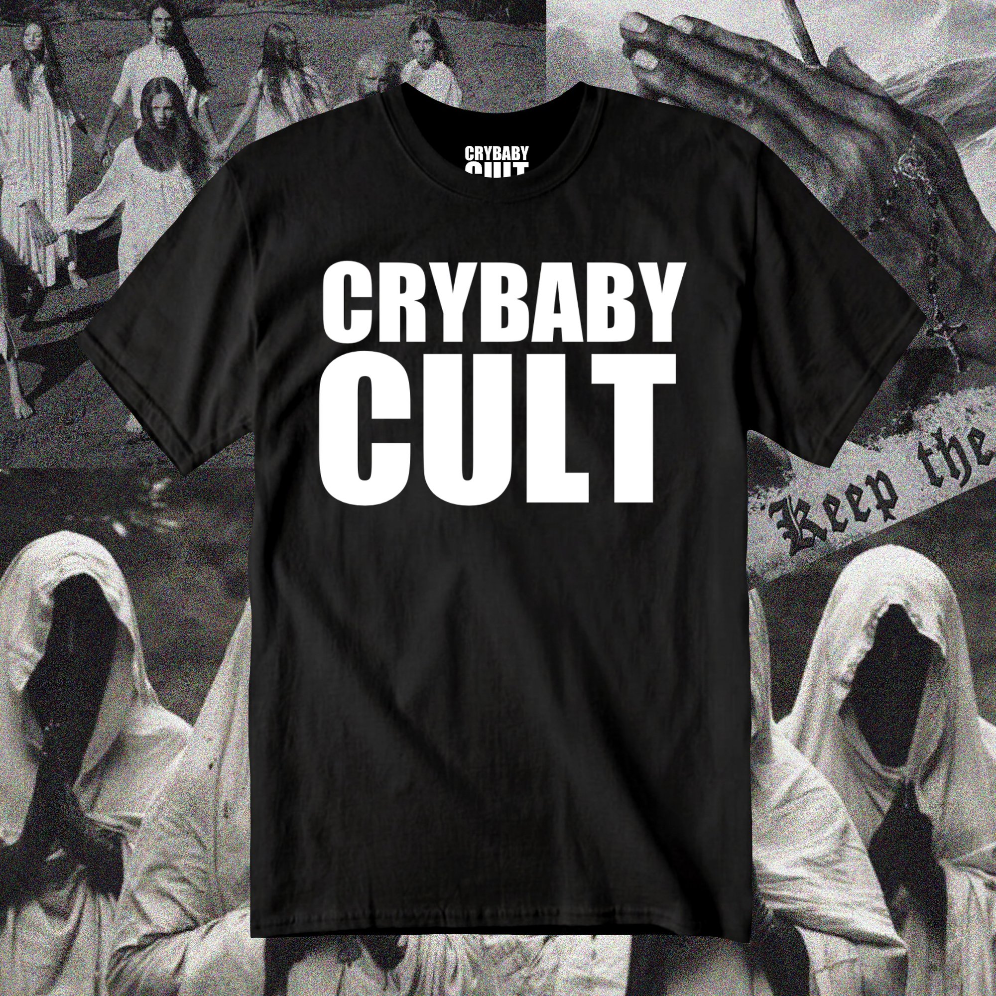 “CryBaby Cult Classic” T-shirt screen printed on heavy black cotton in the cult catacombs.